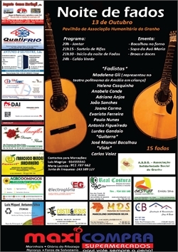 Venha jantar e assistir a uma grandiosa Noite de Fados, dia 13 de Outubro, a partir das 20h, no Pavilhão da Associação Humanitária do Granho.